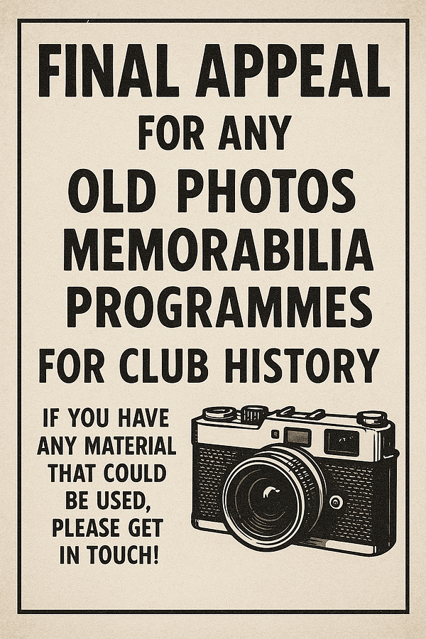 As we move into the final stages of compiling our club history, we are making one last call to our members and supporters. If you have any old photographs, medals, memorabilia, programmes, or other items that you feel could enhance our production, we would love to hear from you.