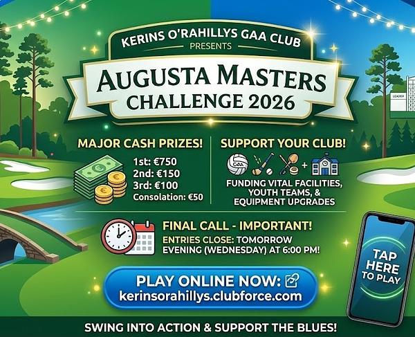 Time is officially running out! With the world's best golfers preparing to tee off at Augusta this Thursday, the deadline to enter the Kerins O'Rahillys Masters Challenge closes tomorrow evening (Wednesday) at 6:00 PM.